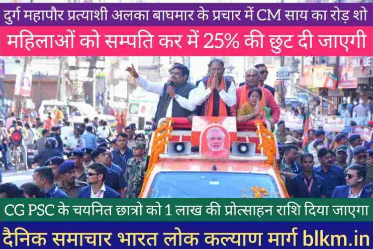 दुर्ग महापौर प्रत्याशी अलका बाघमार के प्रचार में आयोजित रोड़ में CM साय बोले महिलाओं को सम्पति कर में 25% की छुट दी जाएगी. 18 लाख PM आवास बनाए जा रहे हैं