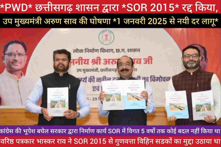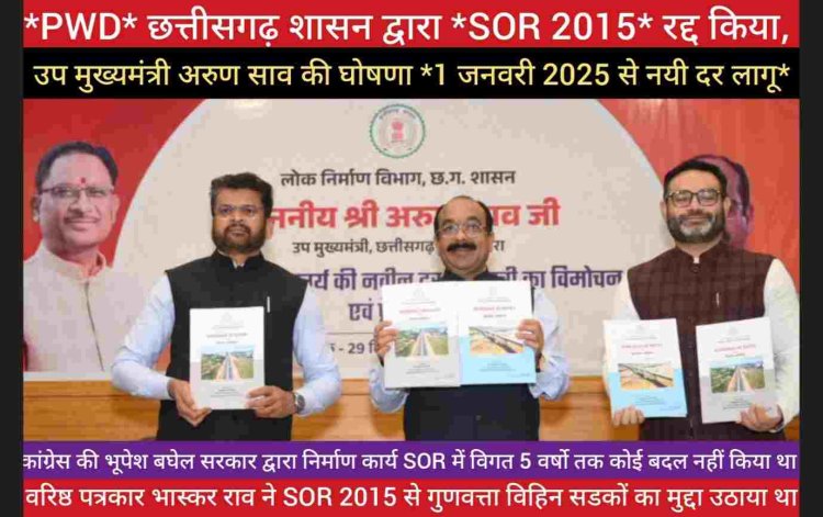 *PWD* के नये *SOR-2025* लागू करते हुए उप मुख्यमंत्री अरुण साव बोले *CM साय सरकार* सड़कों की गुणवत्ता और समय सीमा के प्रति बहुत गम्भीर हैं इससे *मजदूरो की आय भी बड़ जायेगी**/ वरिष्ठ पत्रकार *भास्कर राव* द्वारा 1 माह पूर्व SOR 2015 और गुणवत्ता विहिन सडकों का मुद्दा उठाया था जिसे छत्तीसगढ़ शासन द्वारा गम्भीरतापूर्वक लिया और नयी दर को लागू कर दिया https://youtu.be/TumDnKGpijg?si=S6CWlXAoHAeAXoIJ